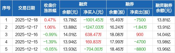 智飞生物:融资净偿还1001.45万元,融资余额13.78亿元(12-18)