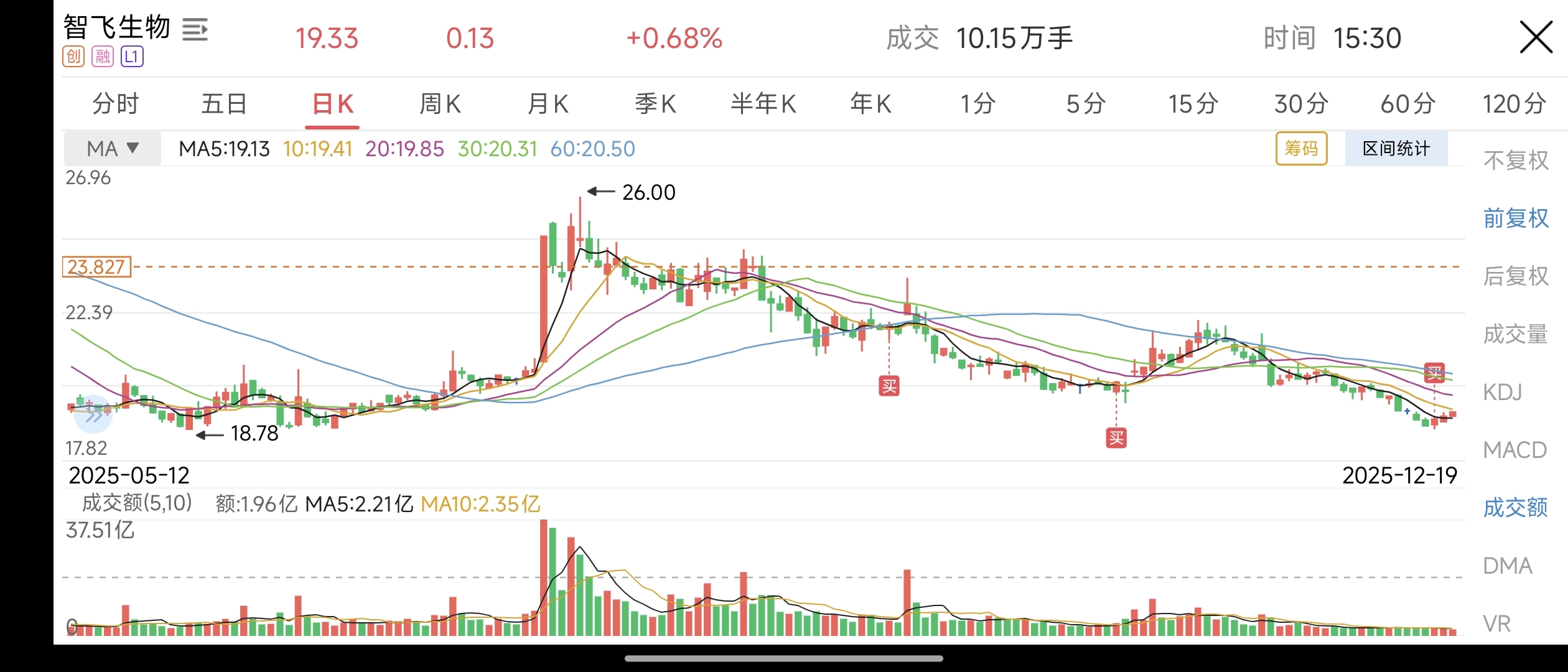 $智飞生物(SZ300122)$ 去年11月份30元以下建仓,今年12月份18元多补仓,成本23.827元。希望是补到最低区间。