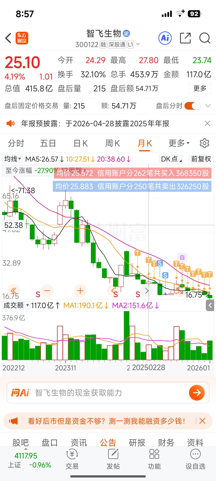 $智飞生物(SZ300122)$ 一年了,成本从25做到21,在20加仓,想着应该反弹吧,没想到啊,直接跌到十七了