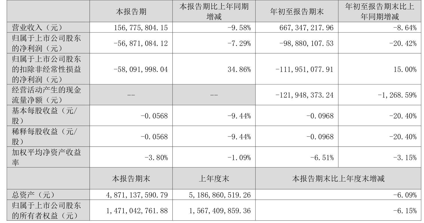 中证智能财讯亚光科技(300123)10月30日披露2025年第三季度报告。前三季度公司实现营业总收入6.67亿元,同比下降8.64%;归母净利润亏损9888.01万元,上年同期亏损8211.3万元;扣非净利润亏损1.12亿元,上年同期亏损1.32亿元;经营活动产生的现金流量净额为-1.22亿元,上年同期为1043.56万元;报告期内,亚光科技基本每股收益为-0.0968元,加权平均净资产收益率为-6.51%。