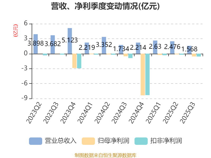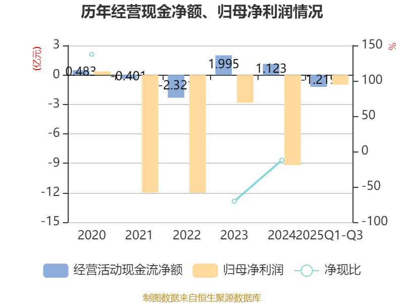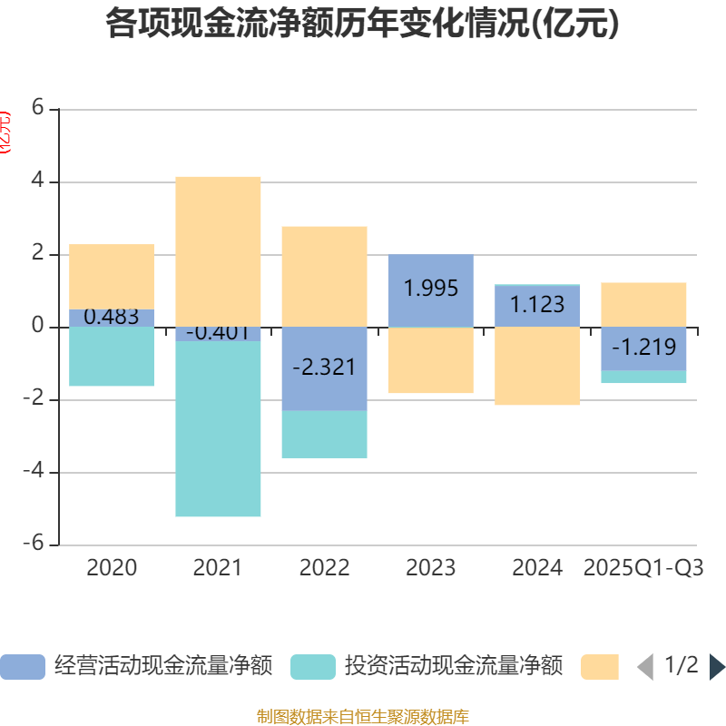 2025年前三季度,公司经营活动现金流净额为-1.22亿元,同比减少1.32亿元;筹资活动现金流净额1.21亿元,同比增加2.69亿元;投资活动现金流净额-3318.92万元,上年同期为4676.1万元。