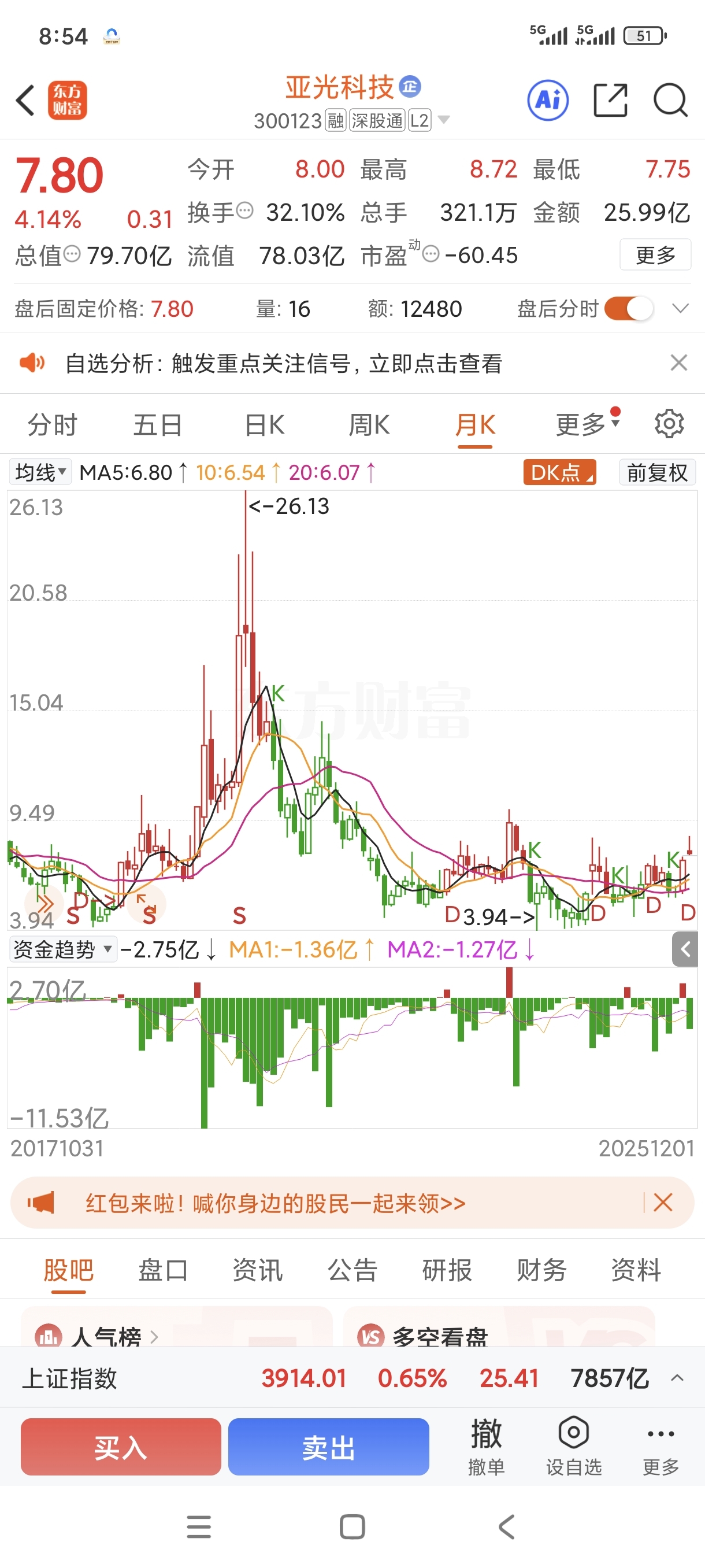 $亚光科技(SZ300123)$ 这种形态不需要慌,拿几个月再回来看看有没有惊喜