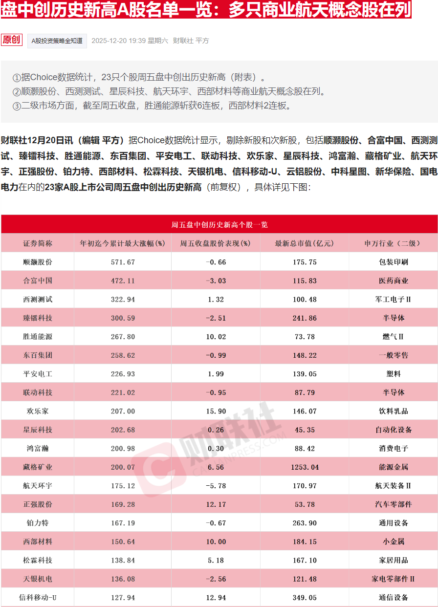 周五盘中23只个股创出历史新高:多只商业航天概念股在列!