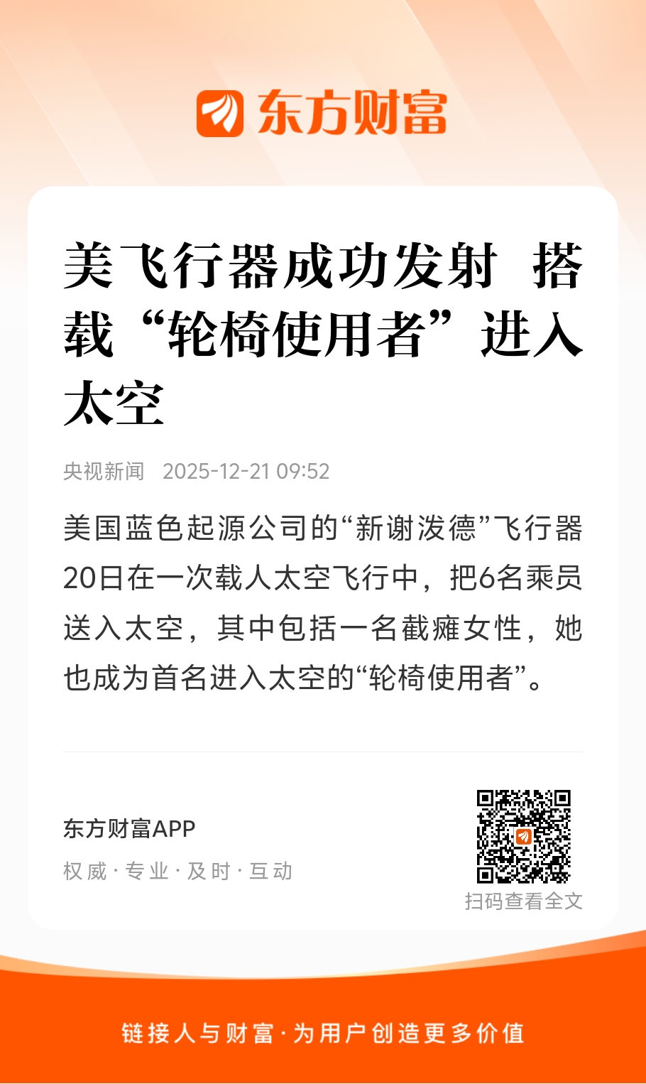 美国蓝色起源公司的“新谢泼德”飞行器20日在一次载人太空飞行中,把6名乘员送入太空,其中包括一名截瘫女性,她也成为首名进入太空的“轮椅使用者”。