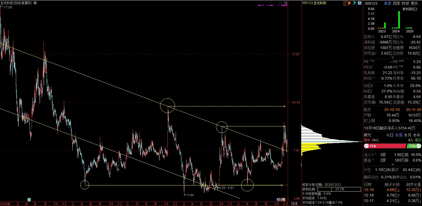 $亚光科技(SZ300123)$ 在7.00-8.50之间震荡,逢低买入。