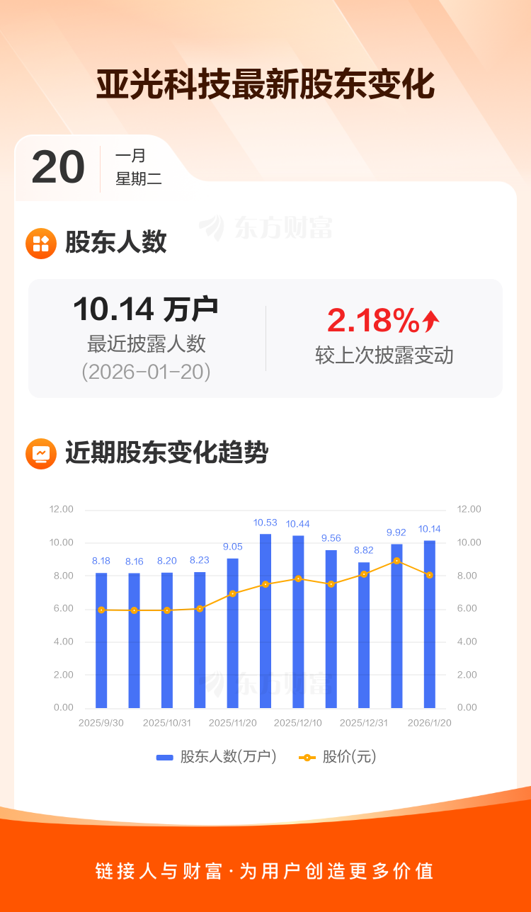 亚光科技最新披露数据显示,截至1月20日公司股东户数为10.14万户,较上期(2026年1月9日)增加2162户,增幅为2.18%。户均持有流通股数量由上期的1.01万股下降至9866股,户均持股金额由上期的8.98万元减少至7.94万元。