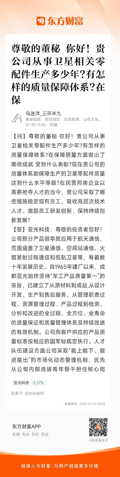 亚光科技$亚光科技(SZ300123)$部分产品早应用于航天通信,涵盖卫星、空间站、火箭及低轨卫星领域,具备数十年经验。公司拥有全流程质量管理体系,产品符合国军标,应用于雷达、航天通信、电子对抗等。自研MMIC芯片用于卫星星座如GW计划,TR组件等配套低轨卫星,星载产品占比15-20%,随商业航天发展,订单落地推动业绩增长。@妙想