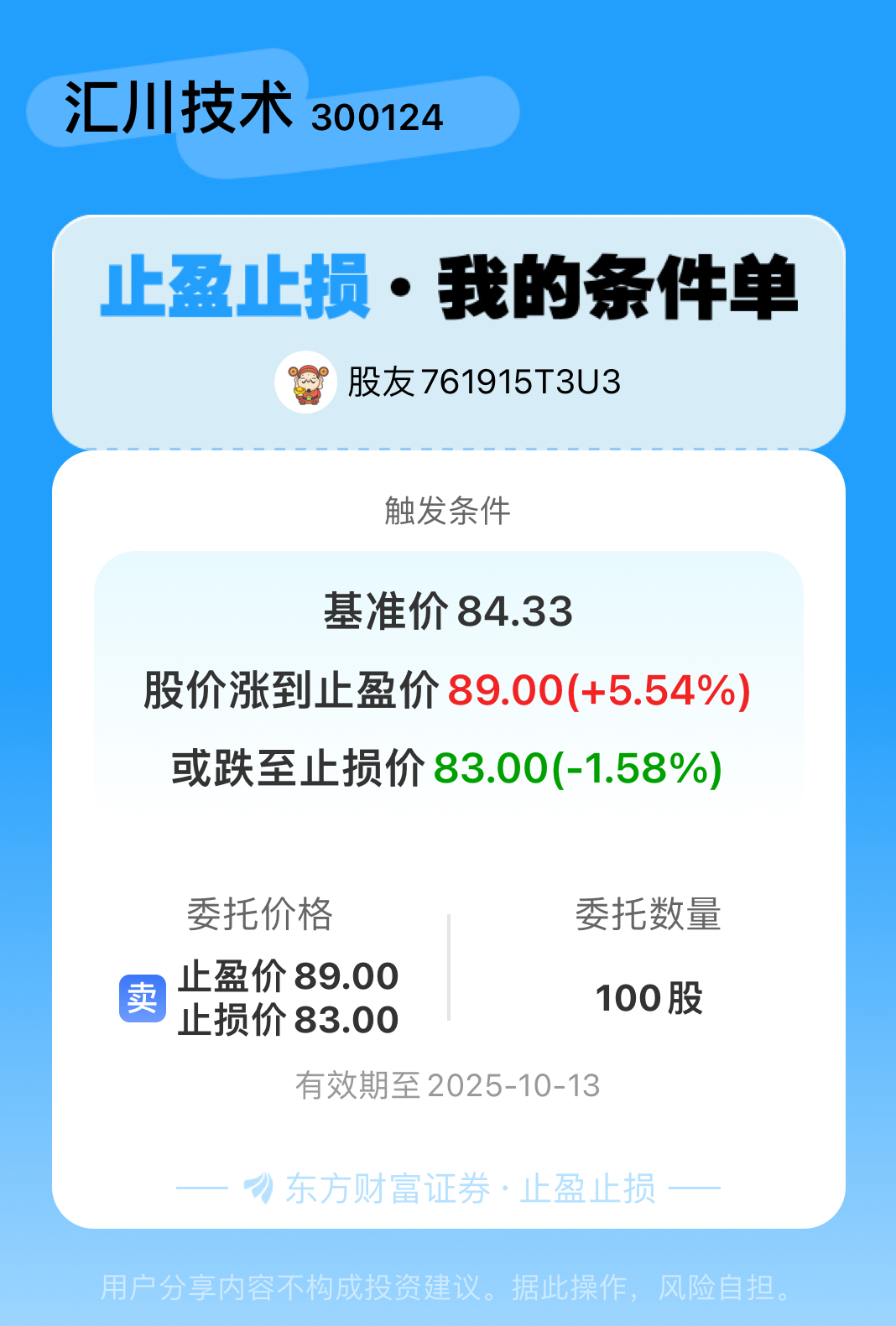 #条件单交流# #止盈止损晒单# 一位股神设置了一个止盈止损条件单,接下来就是见证奇迹的时刻~$汇川技术(SZ300124)$