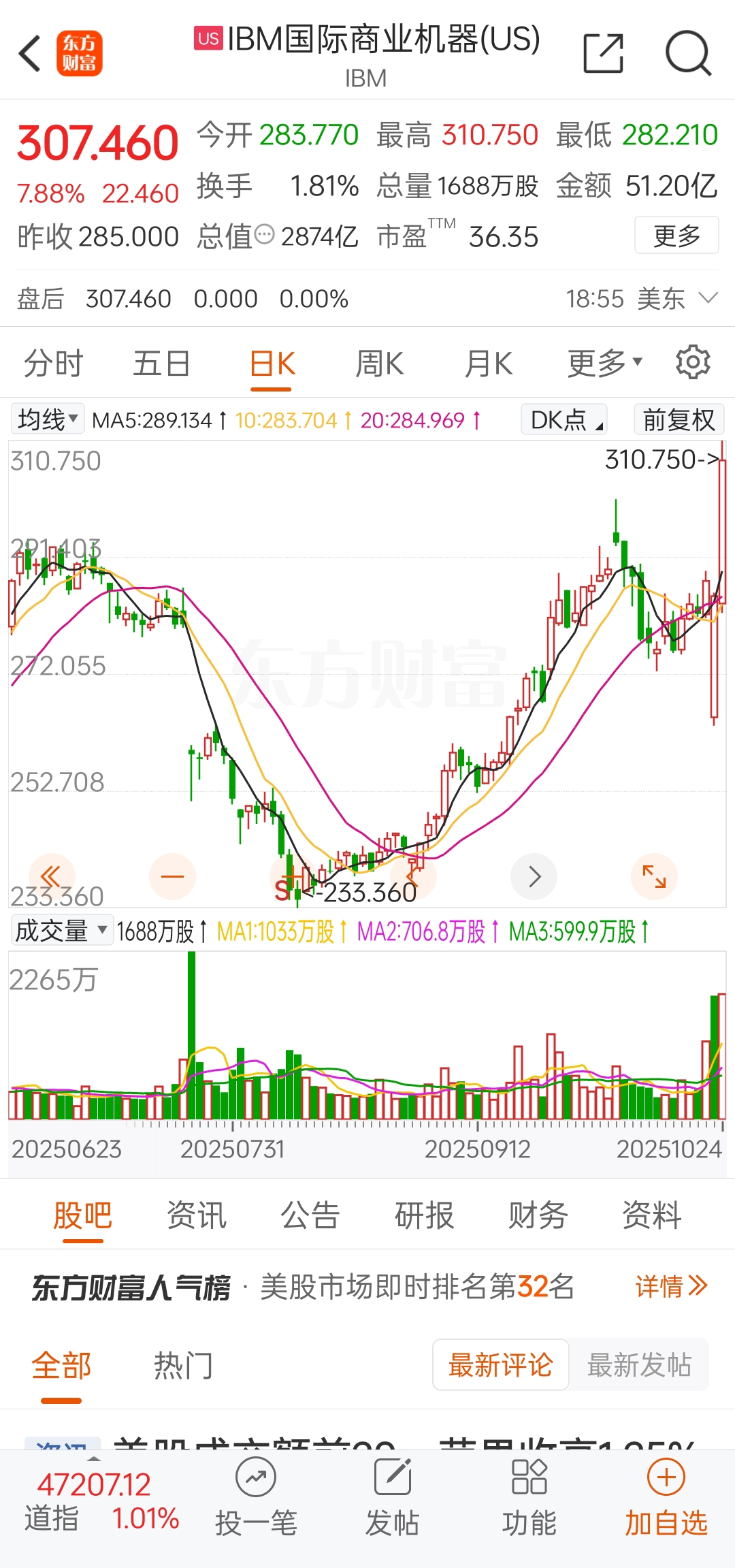 $汇川技术(SZ300124)$ 对于这两天的走势,我也发一张IBM公司前两天的走势图。IBM公司昨天公布了量子计算,前天股价被打压。
