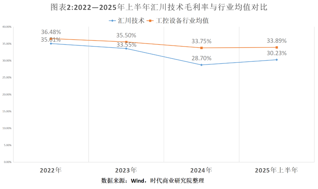 Wind数据显示,如图表2所示,2022—2025年上半年,汇川技术的毛利率分别为35.01%、33.55%、28.70%、30.23%。同期,其所处的工控设备(申万三级)行业毛利率分别为36.48%、35.50%、33.75%、33.89%,持续高于汇川技术。从单个企业来看,汇川技术的毛利率处于行业中下水平。