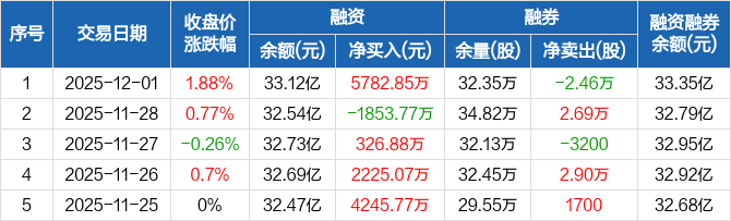 汇川技术融资融券信息显示,2025年12月1日融资净买入5782.85万元;融资余额33.12亿元,较前一日增加1.78%。