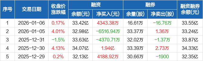 汇川技术:融资净买入4343.38万元,融资余额33.42亿元(01-06)