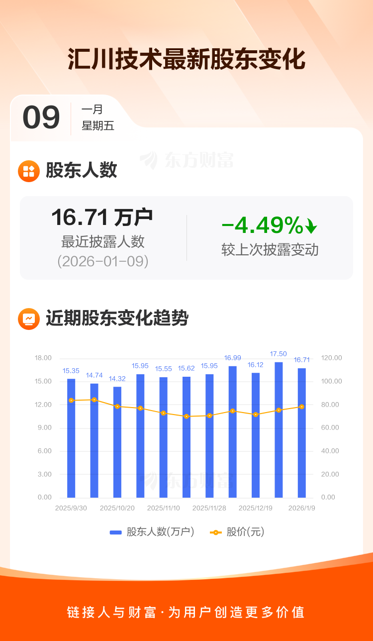 汇川技术最新披露数据显示,截至1月9日公司股东户数为16.71万户,较上期(2025年12月31日)减少7847户,降幅为4.49%。户均持有流通股数量由上期的1.37万股上升至1.44万股,户均持股金额由上期的103.27万元增加至112.38万元。