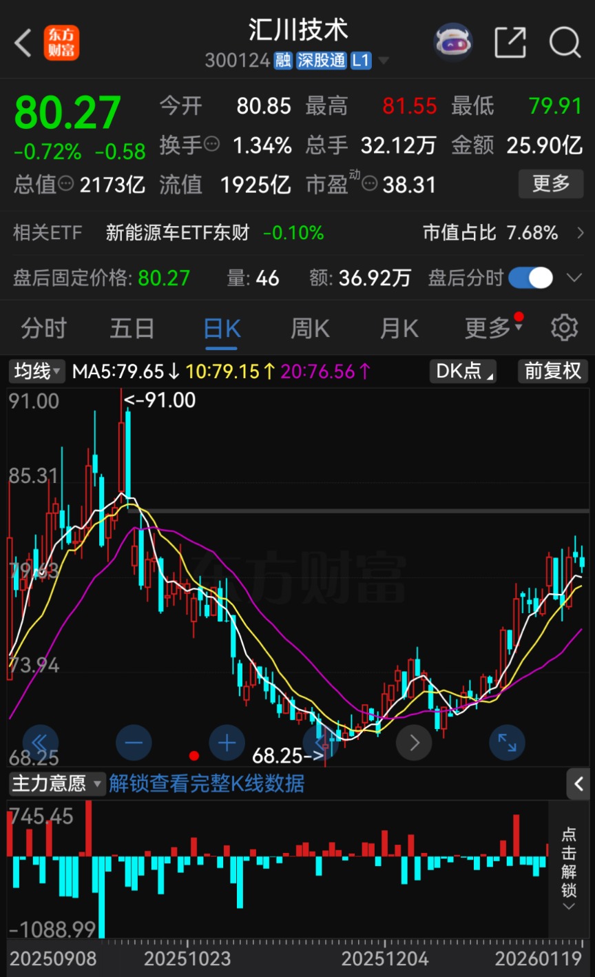 截至1月19日收盘,汇川技术A股股价报80.27元/股,总市值达2173亿元。截至1月9日,公司股东人数达16.71万户。