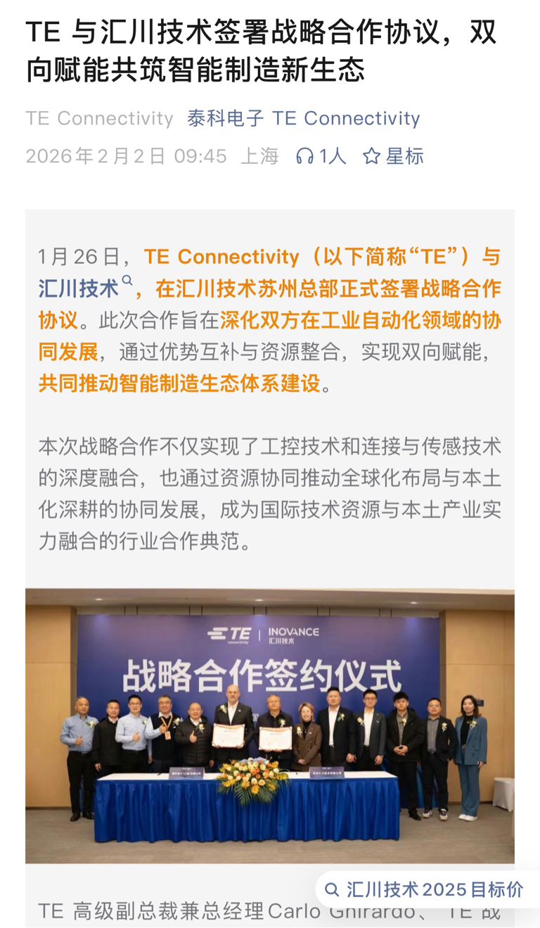 有汇川的股东有福了!汇川要和泰科合作了!要飞起来了!