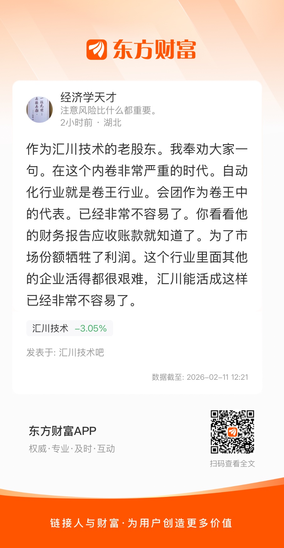 作为汇川技术的老股东。我奉劝大家一句。在这个内卷非常严重的时代。自动化行业就是卷王行业。会团作为卷王中的代表。已经非常不容易了。你看看他的财务报告应收账款就知道了。为了市场份额牺牲了利润。这个行业里面其他的企业活得都很艰难,汇川能活成这样已经非常不容易了。