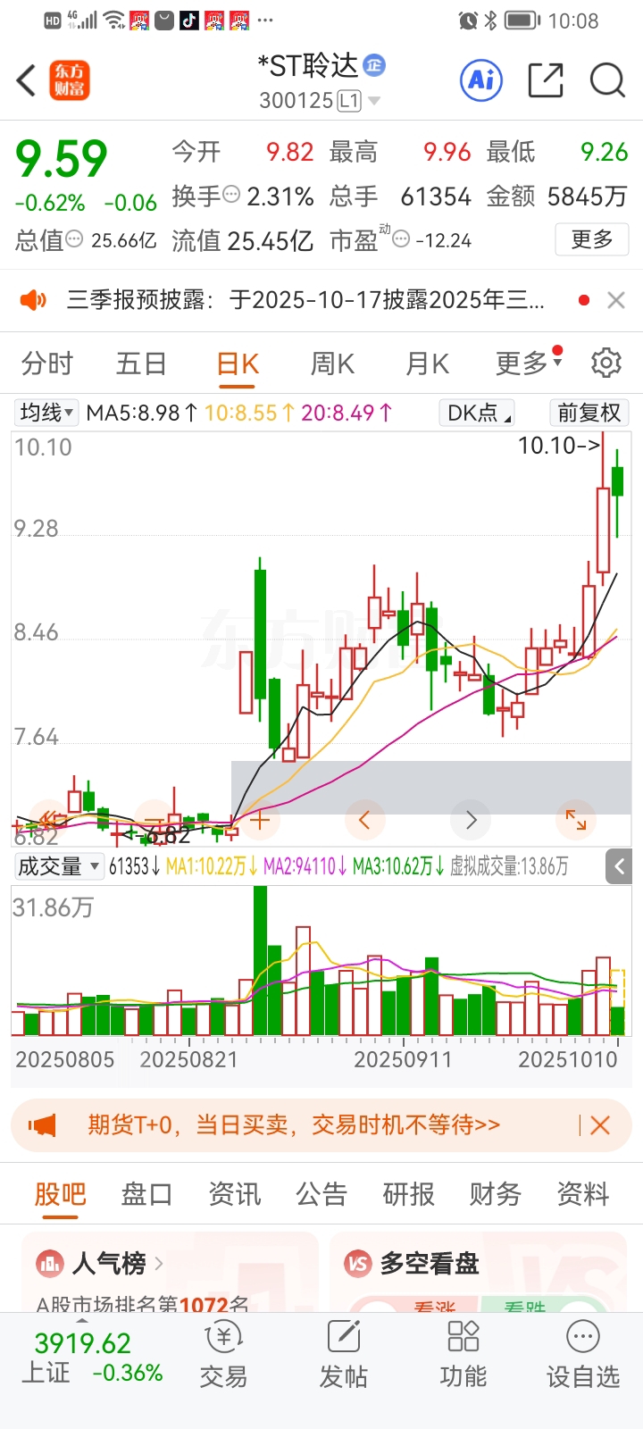 $*ST聆达(SZ300125)$ 强者恒强,跌不下就往上走呗,sT板块大V股$*ST沐邦(SH603398)$ 废了,$*ST正平(SH603843)$ 关了小黑屋,市场题材只有达子可当龙头了。
