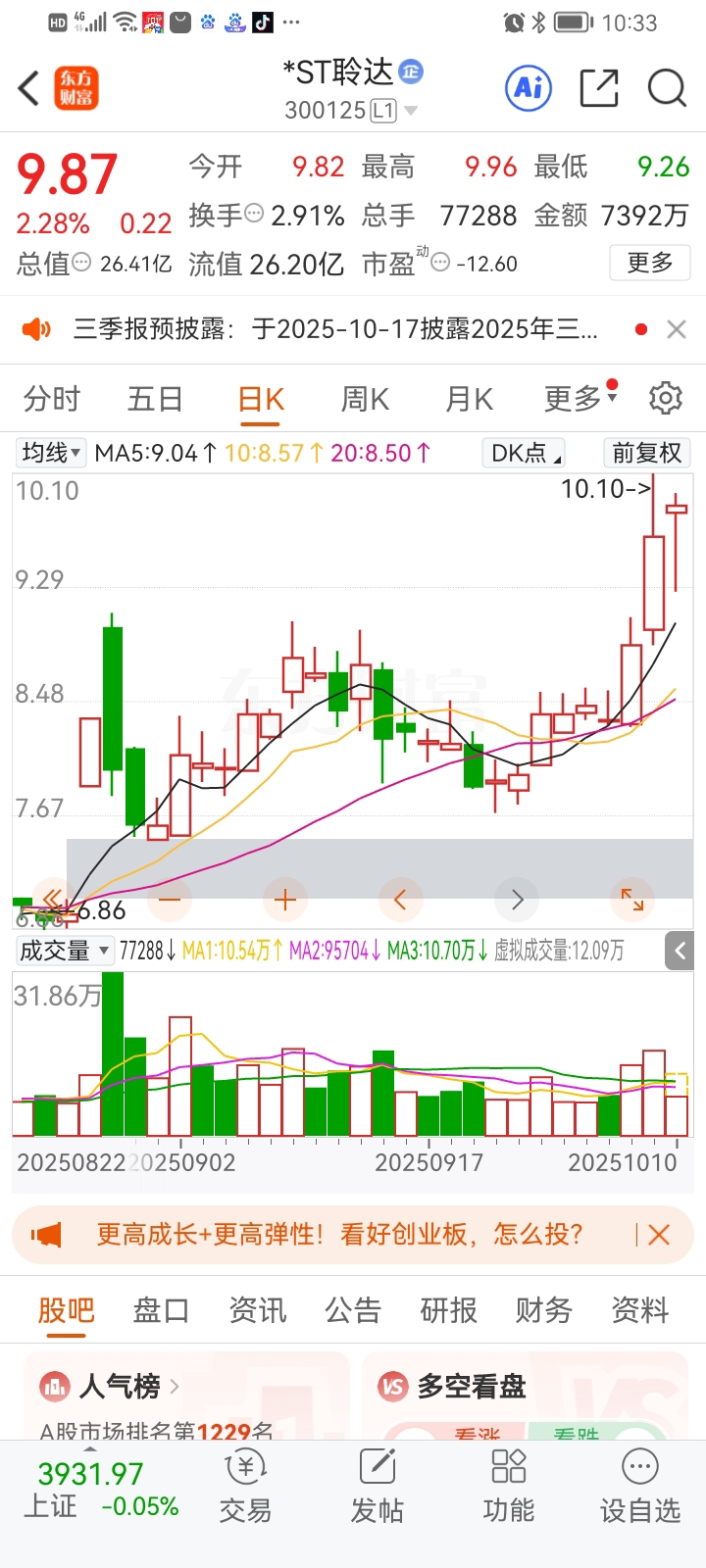 $*ST聆达(SZ300125)$ 抓住一支牛骨,胜过十年牛市。聆达业绩于下周10月16日晚上公告,处于st板块的第一批公告业绩的;重整资产注入是半导体,重整投资人实力雄厚。技术面处于上升通道等等。总而言之,是可以引起大家高度重视和关注的好的St之一。风险自担!$*ST宇顺(SZ002289)$ $*ST正平(SH603843)$