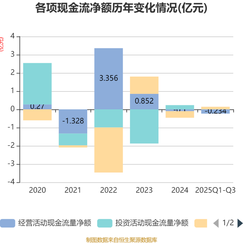 2025年前三季度,公司经营活动现金流净额为-2339.68万元,同比减少2706.96万元;筹资活动现金流净额1423.24万元,同比增加6585.44万元;投资活动现金流净额-4702.75元,上年同期为1905.47万元。