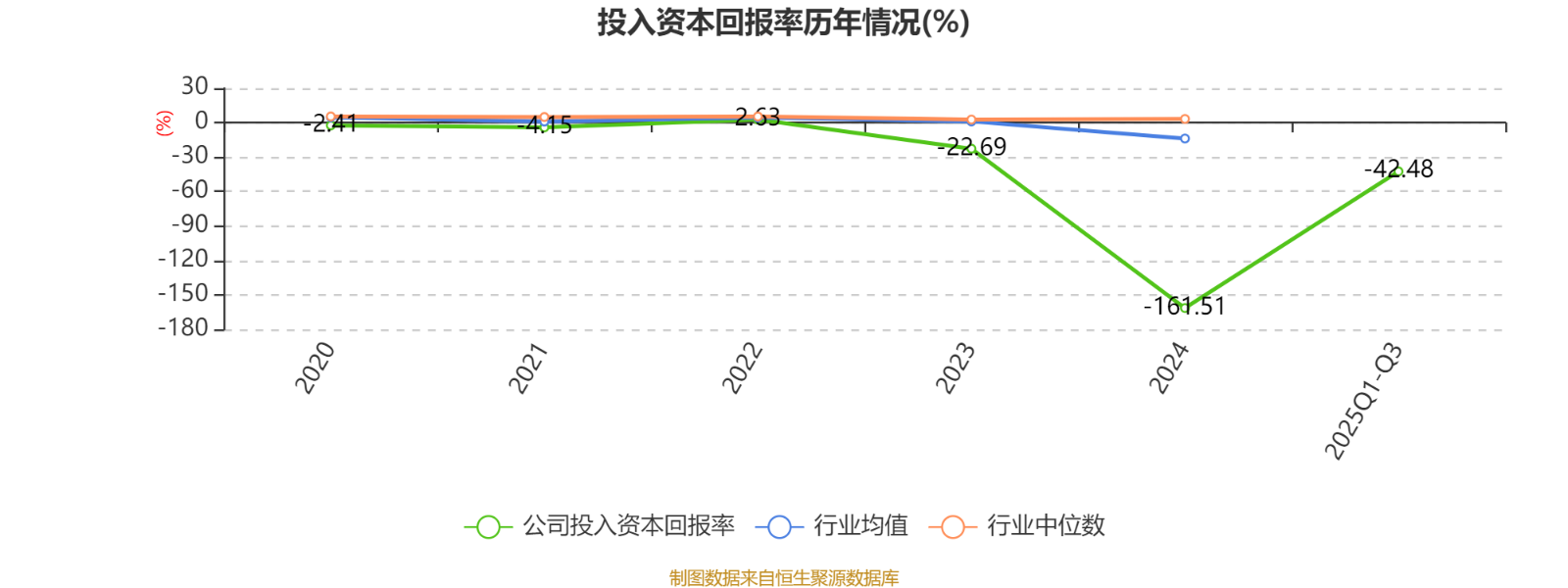 公司2025年前三季度投入资本回报率为-42.48%,较上年同期上升62.74个百分点。