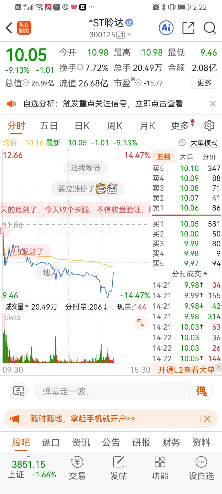 $*ST聆达(SZ300125)$ 急跌不怕就怕阴跌,急跌证明重整时间紧了,一定要把墙头草和短线投机者淘汰出局,坚定聆达半导体重整完后必破历史新高,任何一支牛骨的上涨都要经受挫折才不断创新高,新的六个牛散成本不低,起码到九元左右,达子十元下大胆抢筹。$*ST正平(SH603843)$ $*ST沐邦(SH603398)$