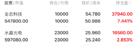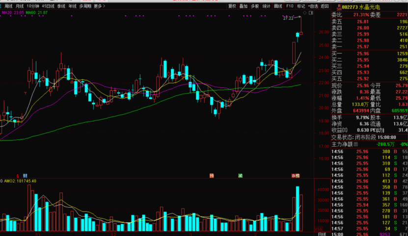 水晶光电002273,消费电子、AI眼镜概念股,老李上周五新介入的强势品种,该股周四以涨停的方式突破横盘近4个月的高位平台,基本面业绩优良,且是行情核心热点的消费电子概念,老李认为它突破后开始拉升行情的机会较大,所以周五上车。经过周五及今天的观察,走势比较强,暂时符合突破拉升的技术要求,昨天开盘后虽然大盘下跌,但水晶光电能高开放量冲高,早盘看到它的抛压很大,但做多资金能承接住,并继续拉升,最高涨幅达6%,之后平稳的加落,涨1.41%收盘,高位出现长上影线,这种技术走势几乎可以肯定今天早盘主力会洗盘,早盘会跳水然后收复,尾盘跌1%左右收盘,大盘好的话会红盘报收。