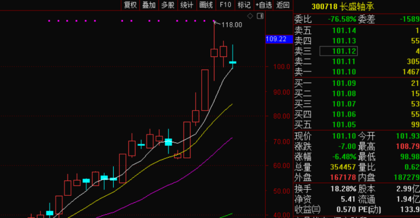 $长盛轴承(SZ300718)$长盛轴承300718,宇树机器人第一龙头股。说是2025年第一牛股都不过份,现在涨幅已经很大,近几天在高位出巨大震幅,初步出现见顶迹象,但只是初步迹象,还有反复拉升的短线机会,就像老李高位做杭钢股价那样,做得准还会有20+的肉食。昨天长盛轴承首次在高位出现大跌,收盘跌6.48%,然而并没有出现大的阴线实体,而是小星的K线,因为是低开5.71%开盘的,开盘后竟然没有爆跌,早盘还逆市出现拉升翻红的走势,说明多头依然在做多。经过回调到5日线,老李分析今天有入手的机会,预期早盘一定会快速跌破5日线洗盘,洗盘后有可能快速拉升,也有可能下午才拉升,可以关注盘面,一旦出现大单异动翻红就可以跟进。