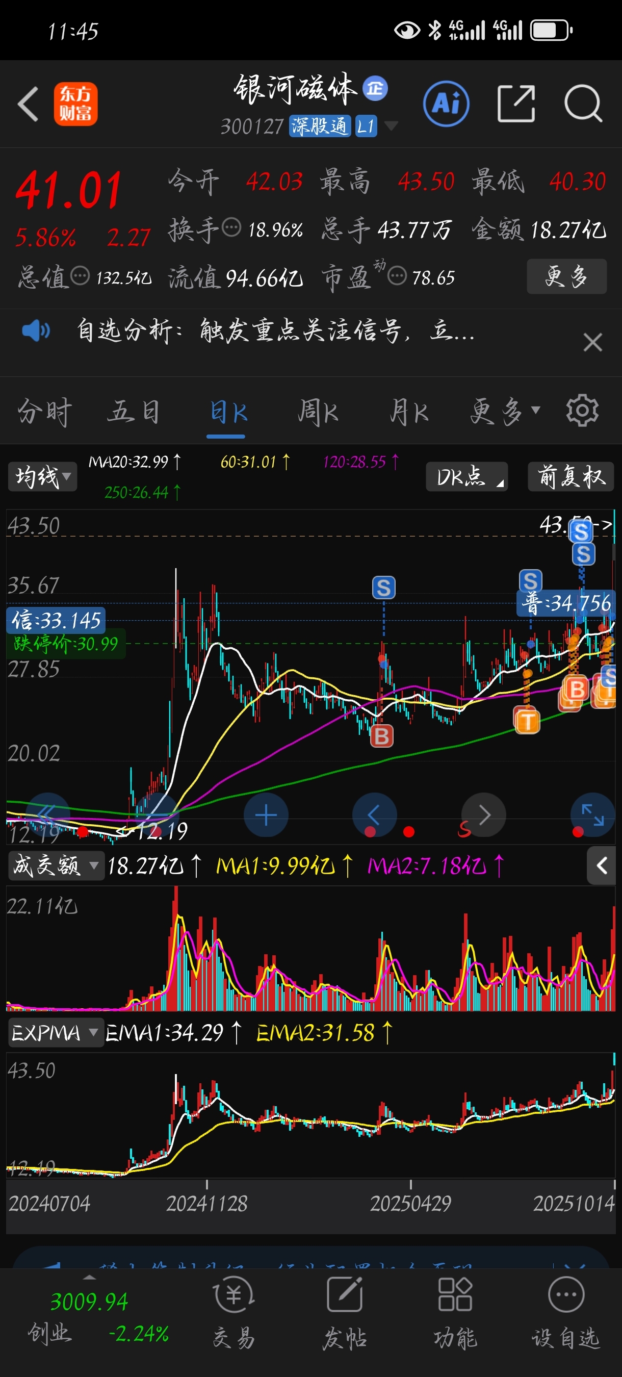 希望银河磁体今日放量企稳就好,收盘价在均线以上,成交金额22.11亿以上,之后都