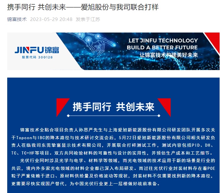 就此,可以确认,锦富技术正在联合多家光伏上市公司开发替代EVA和POE的新组件封装材料!