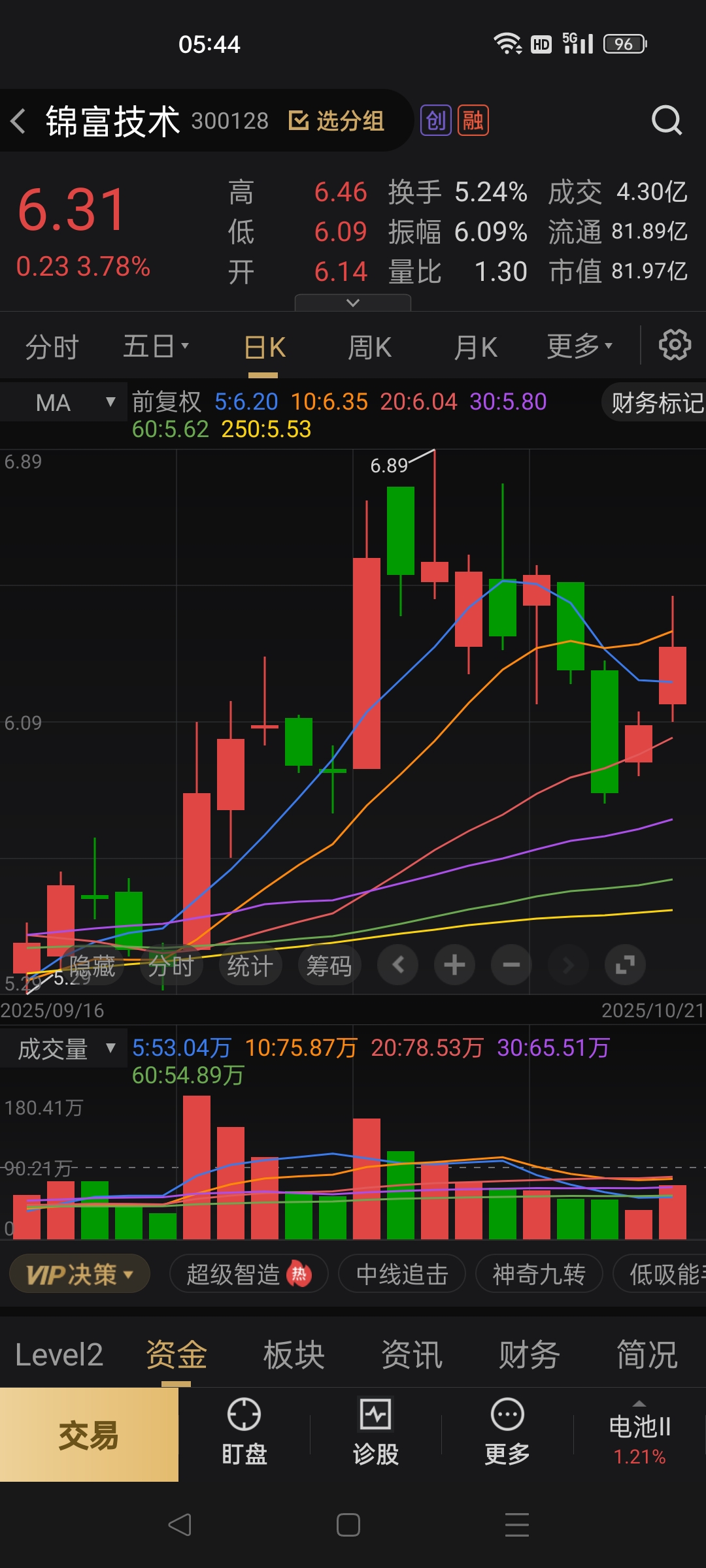$锦富技术(SZ300128)$ #复盘记录# 9月23大阳5.88收盘价对比大阴10月17日6.31*1.1=6.94元正好前高
