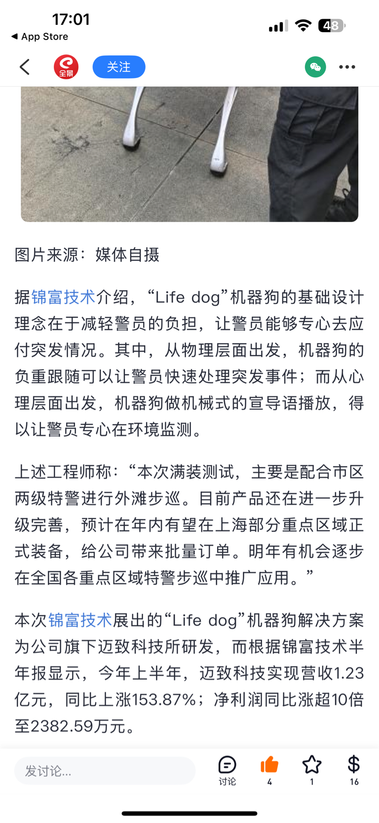 本次锦富技术展出的“Life dog”机器狗解决方案为公司旗下迈致科技所研发,而根据锦富技术半年报显示,今年上半年,迈致科技实现营收1.23亿元,同比上涨153.87%;净利润同比涨超10倍至2382.59万元。
