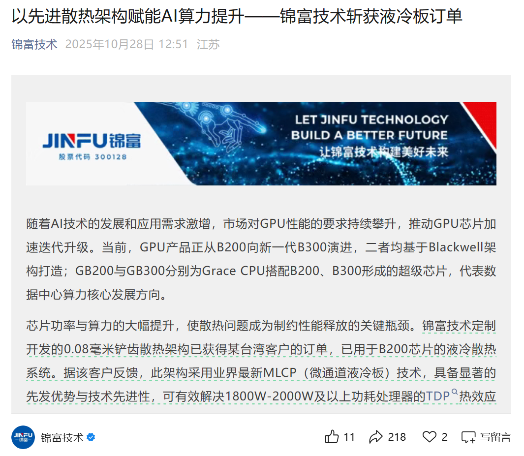 锦富最近好强,前期布局的各项业务要到收获期了,公司的液冷板也获得了订单。
