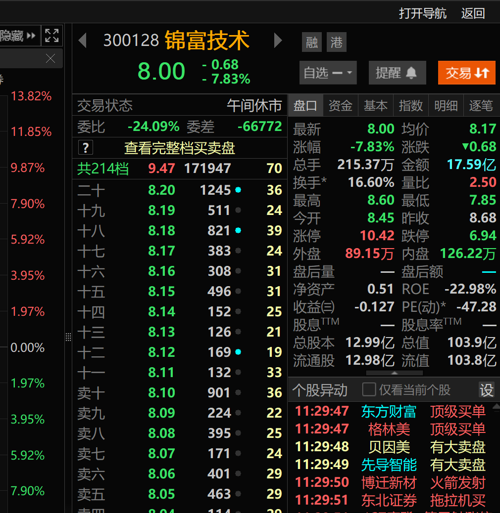 靠小作文涨上 178元 的$淳中股份$涨停,实锤供货的 8 元锦富在负 8 点挣扎