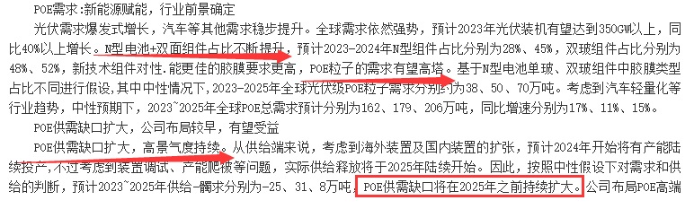 尤其今年N型组件投产爆发,将带来POE的巨大市场空间,看看鼎际得研报里机构的分析: