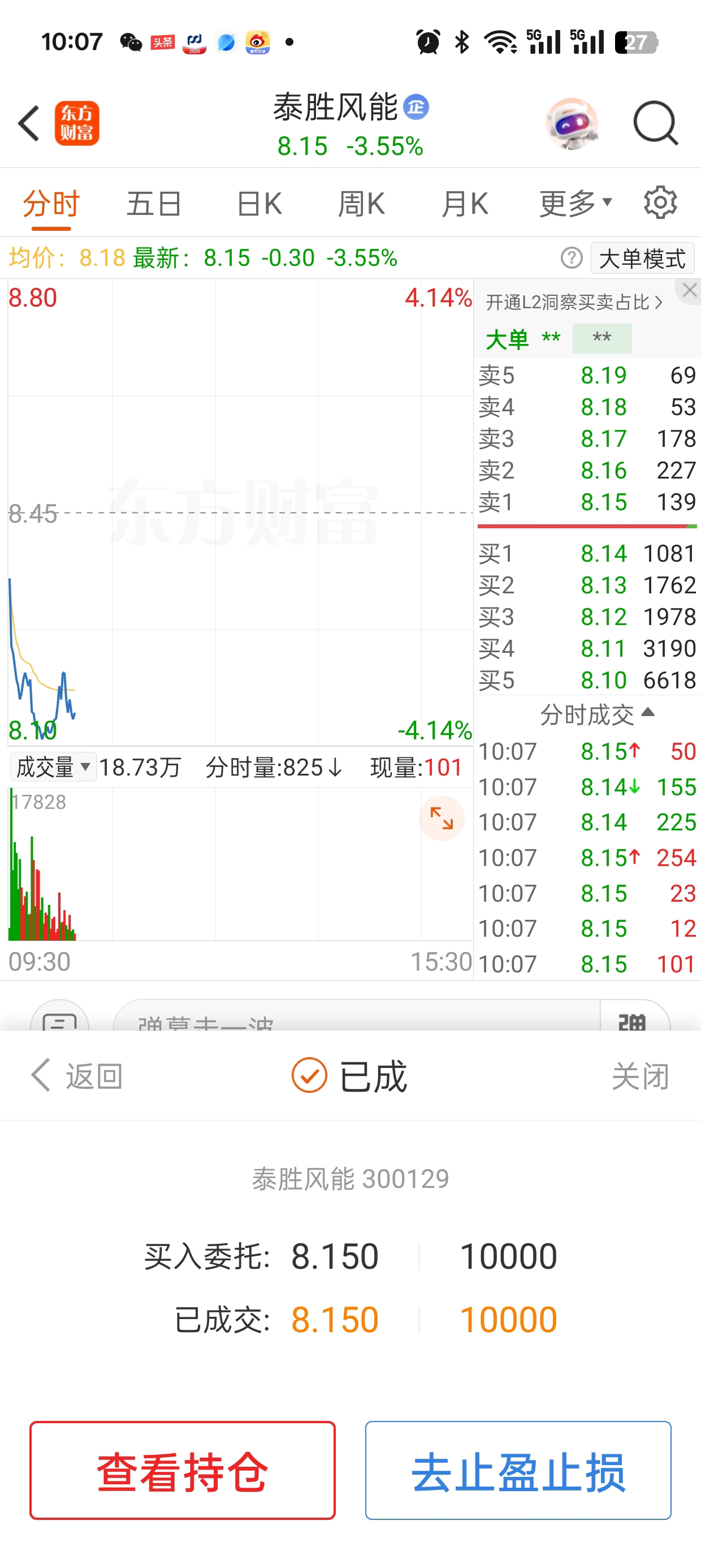 $泰胜风能(SZ300129)$ 今天重新建仓8.15,照样每跌0.15元进1万股,当然明天上去我也会出的,这是第五轮做泰盛了,不知道泰盛会跌到多少,而我又能赚到多少,上次建仓是11.43元,而这次是8.15元。。少了很多钱