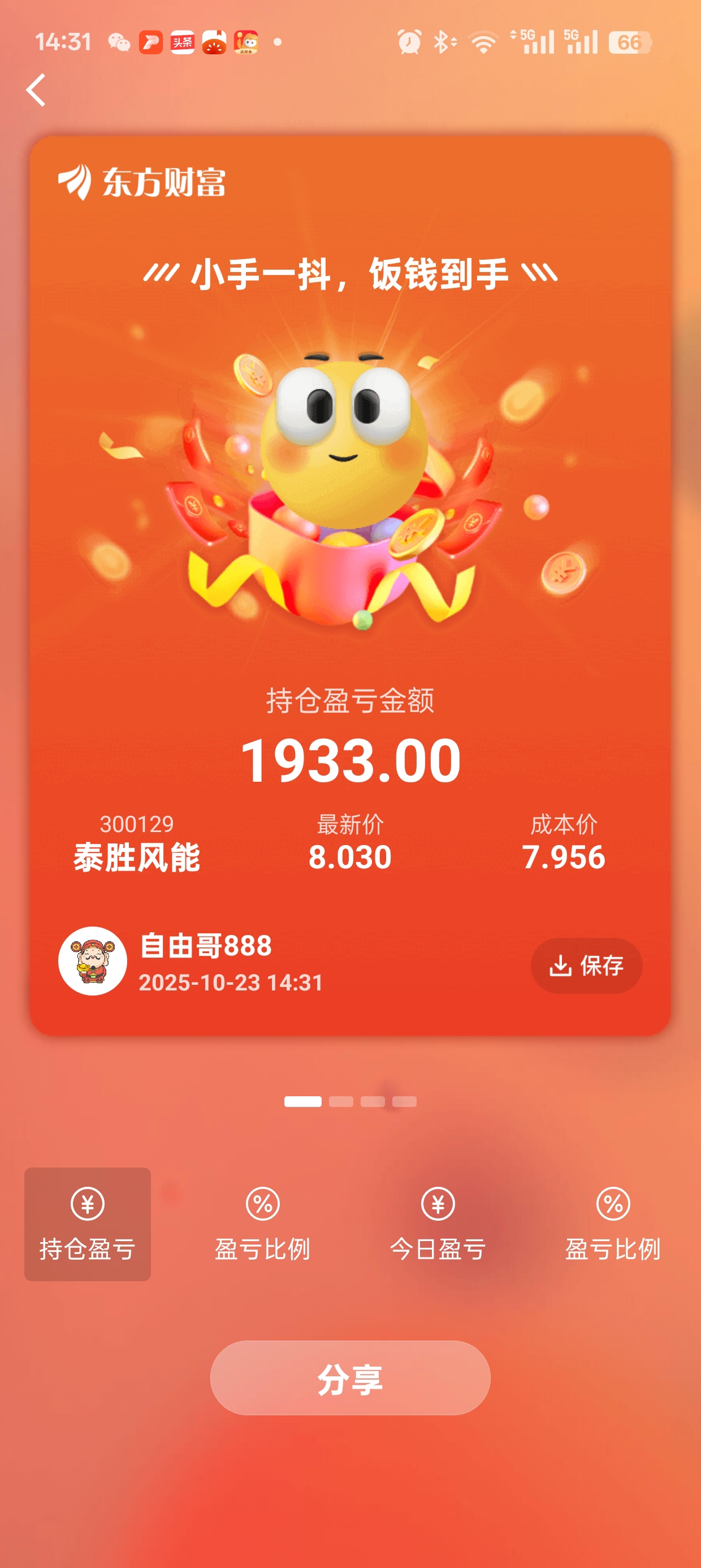 $泰胜风能(SZ300129)$ 第五轮建仓操作泰胜,目前还盈利了