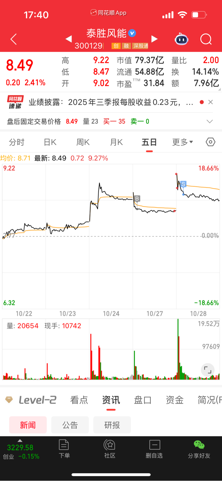 $泰胜风能(SZ300129)$ 昨日建仓,今早开盘超预期,加仓买入,后盘面走弱,反T降仓。看明天了