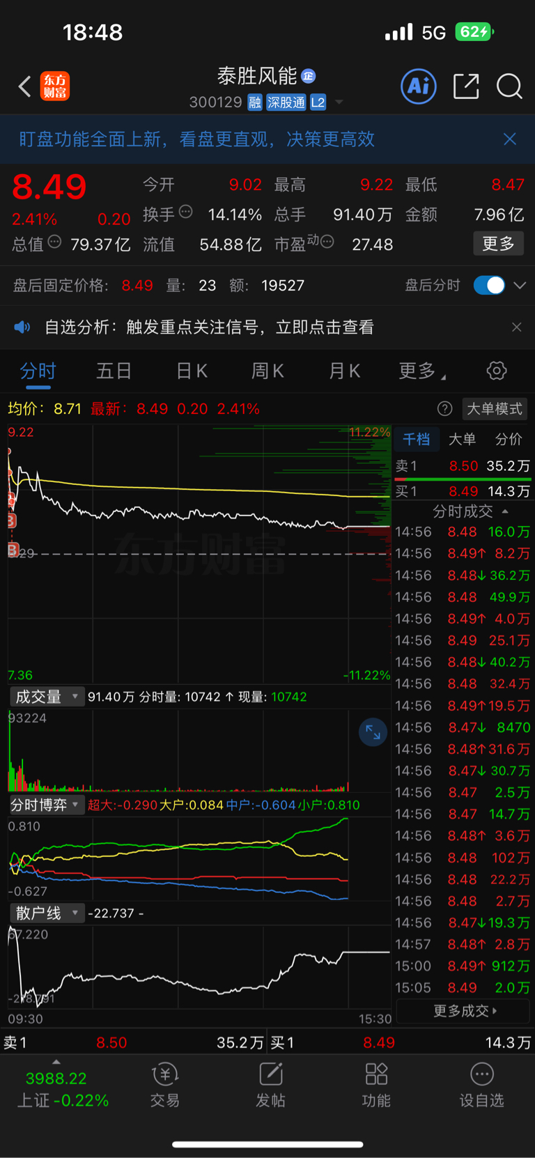 $泰胜风能(SZ300129)$ 不追不追又高了 短线明天阳线就是揉搓线了 不是就跑吧