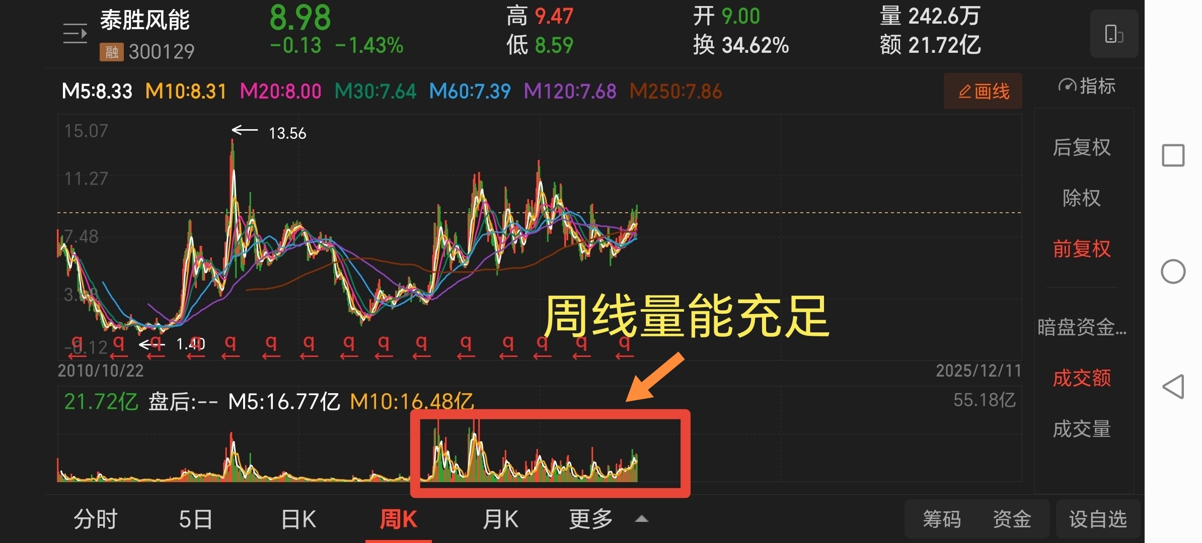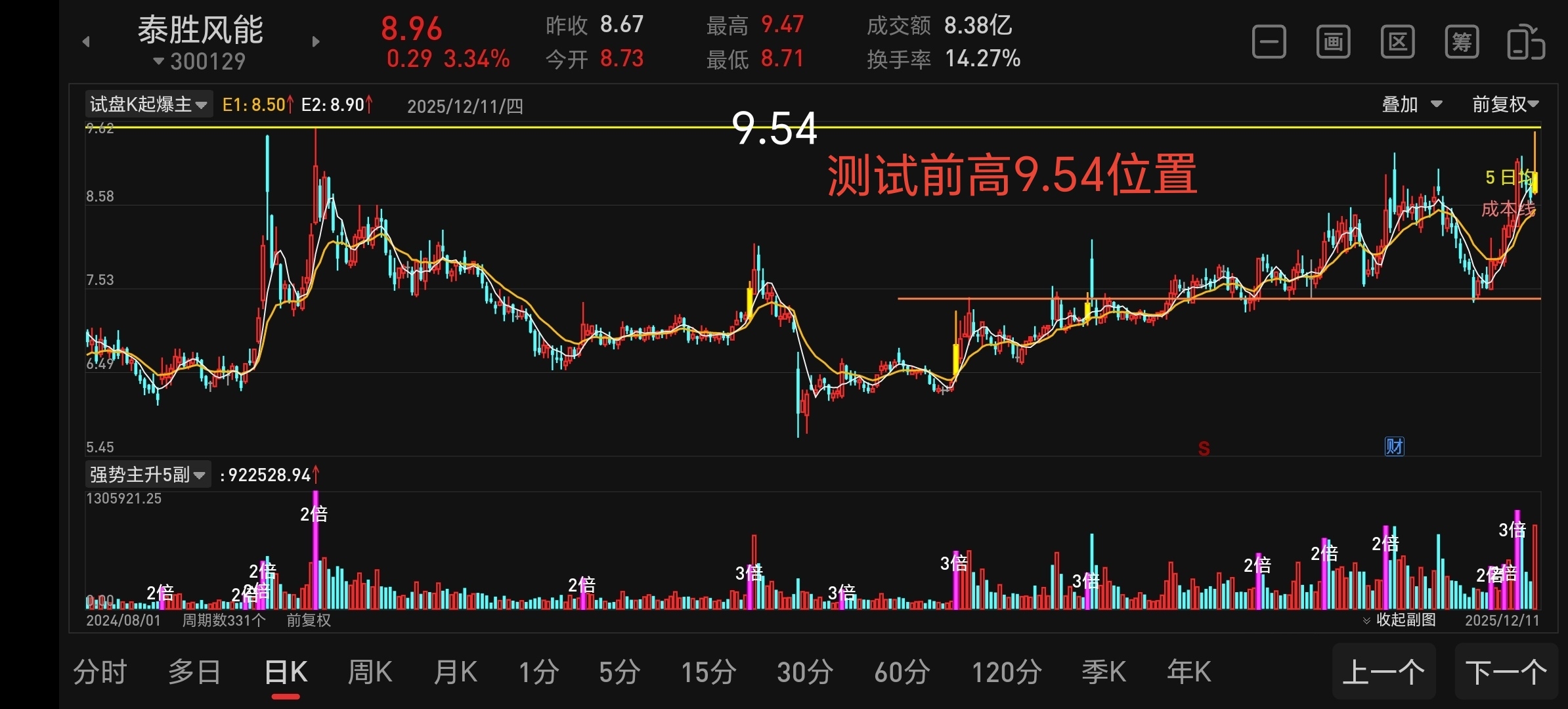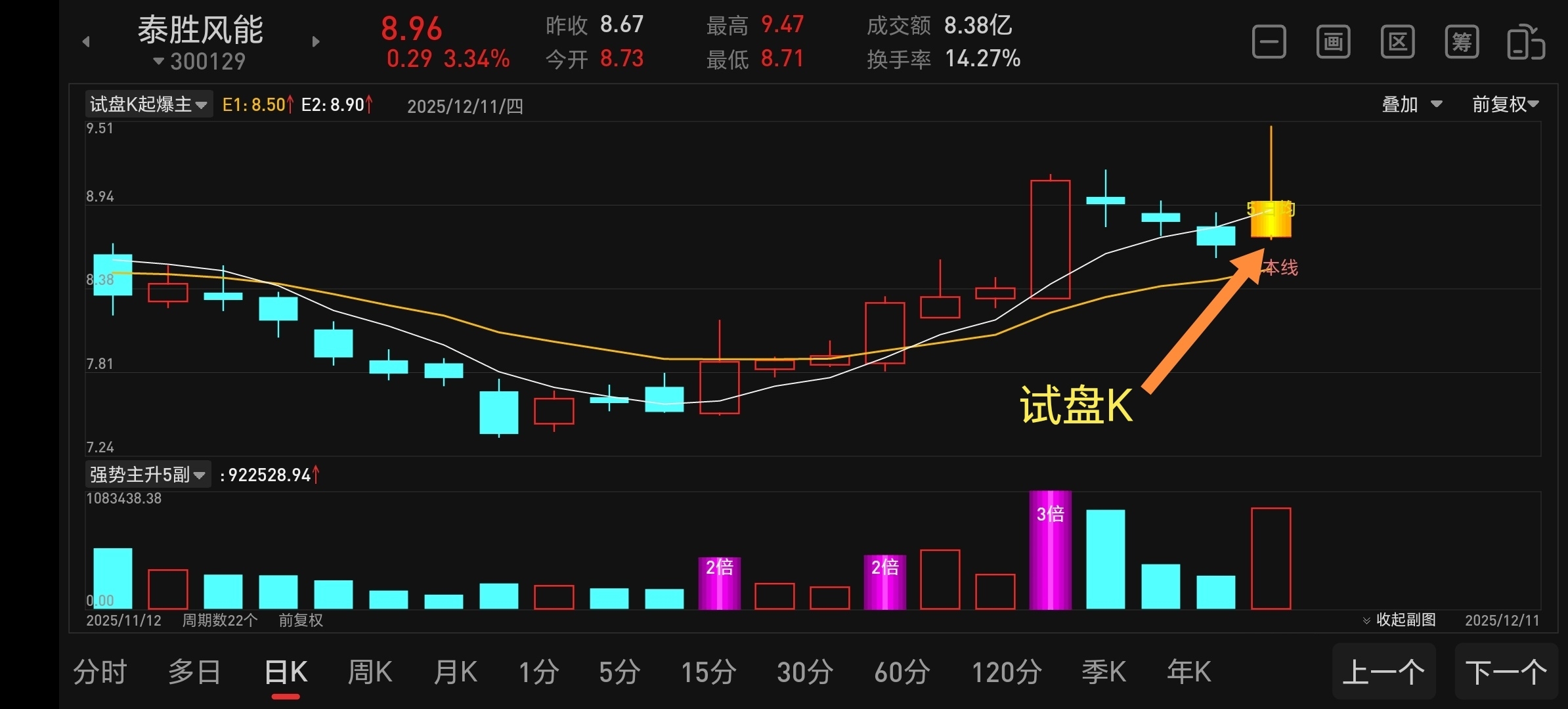 今天泰胜出现了试盘k,主力测试左侧前高9.54,唯一不足就是量小了点,高度差了点