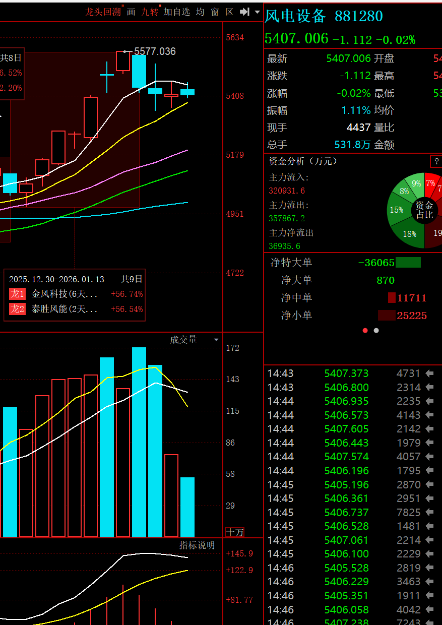 金风科技周一还会继续跌停躺着,泰胜周一碰十日线,继续缩量阴跌。