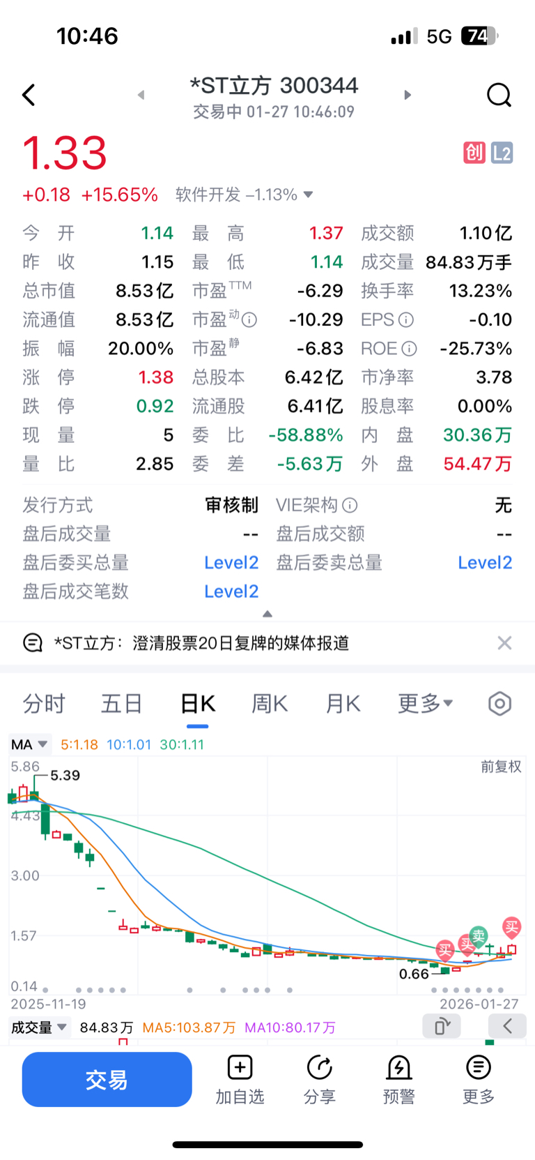 最后就是ST了,后悔昨天没有抄底,今天才来回来追高
