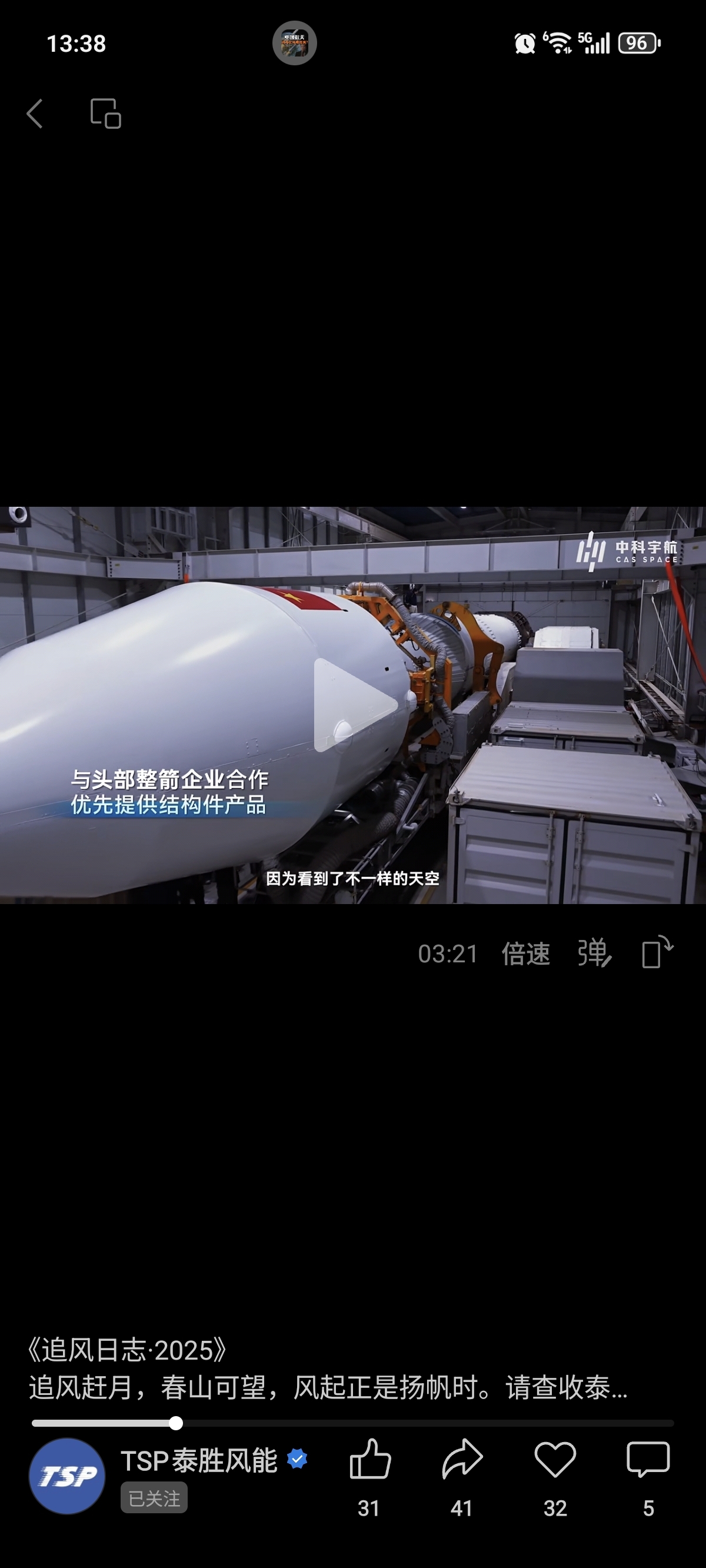 『官方实锤和中科宇航提供部件』泰胜风能官宣与头部火箭企业中科宇航合作,优先提供核心结构部件产品 视频3分23秒