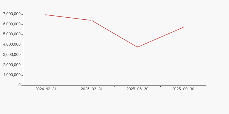截至2025年9月30日,公司最新总股本为5.67亿股,其中流通股本为4.34亿股。户均持有流通股数量由上期的5208股上升至8297股,户均流通市值22.93万元。