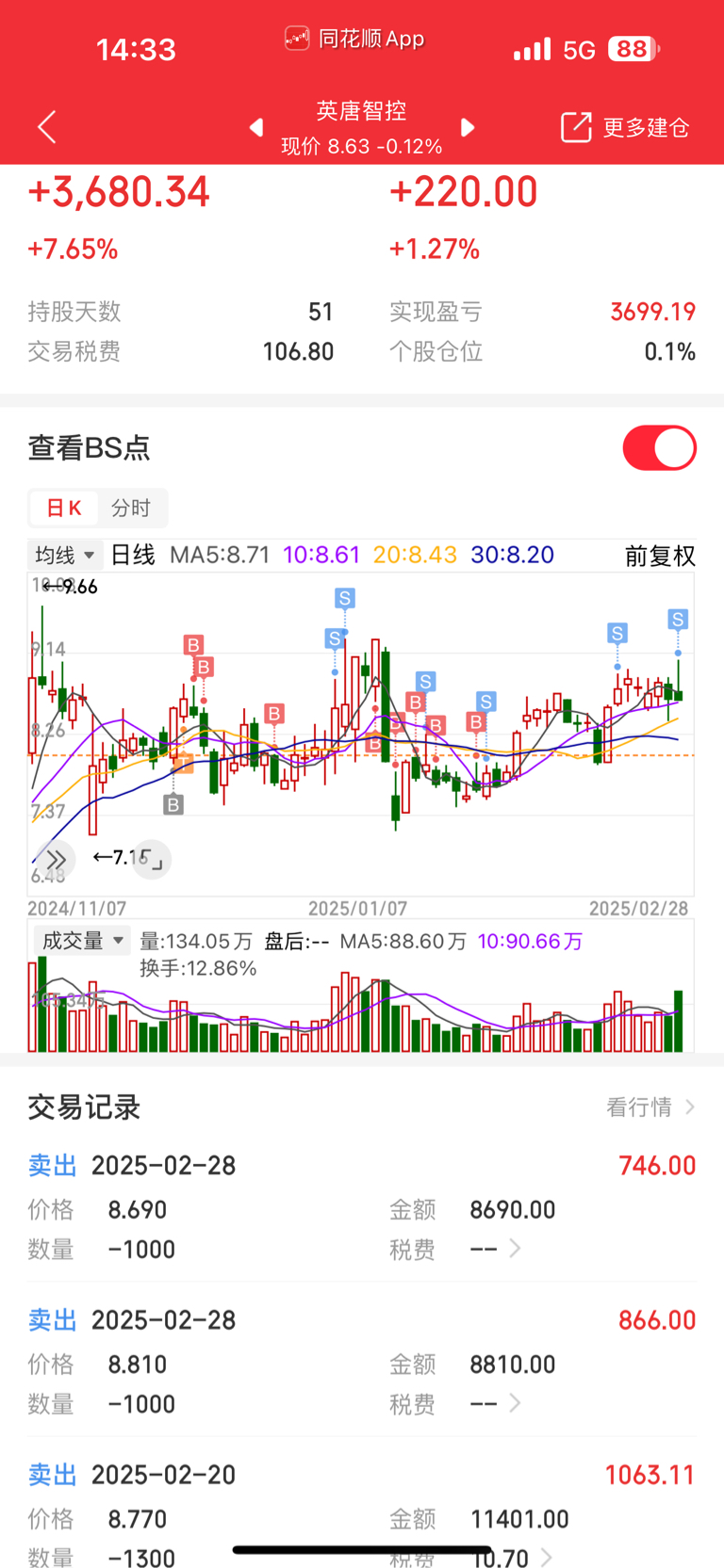 以8.81元和8.69元分两次将英唐智控出了,祝留下的兄弟们发财,晒图为证。