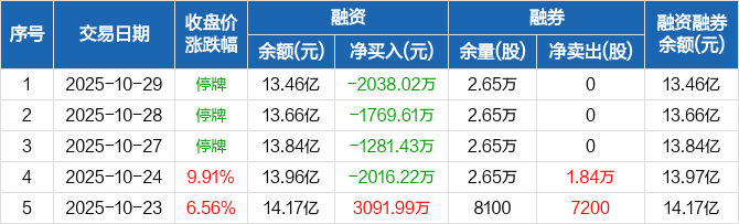 融资方面,当日融资买入0元,融资偿还2038.02万元,融资净偿还2038.02万元,连续4日净偿还累计7105.28万元。融券方面,融券卖出0股,融券偿还0股,融券余量2.65万股,融券余额30.26万元。融资融券余额合计13.46亿元。