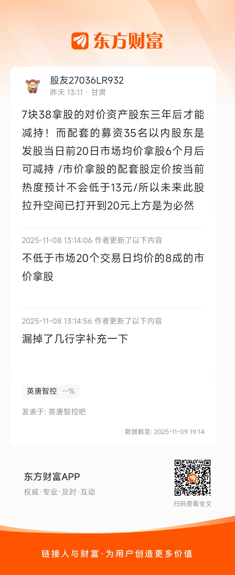 7块38拿股的对价资产股东三年后才能减持!而配套的募资35名以内股东是发股当日前20日市场均价拿股6个月后可减持 /市价拿股的配套股定价按当前热度预计不会低于13元/所以未来此股拉升空间已打开到20元上方是为必然