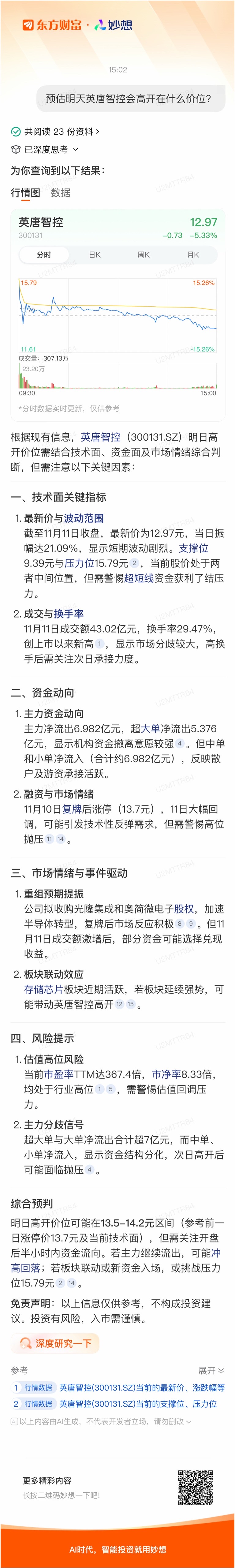 预估明天英唐智控高开在什么价位?13.7-14.2