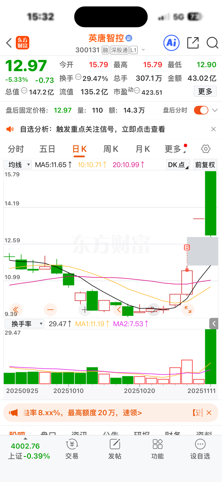 $英唐智控(SZ300131)$ 今天被套的莫慌,我这个老庄还没走呢,玩股票得胆子大,随大溜要亏死呢。昨天没想到今天这样的走势,同样明天走势大家也预料不到