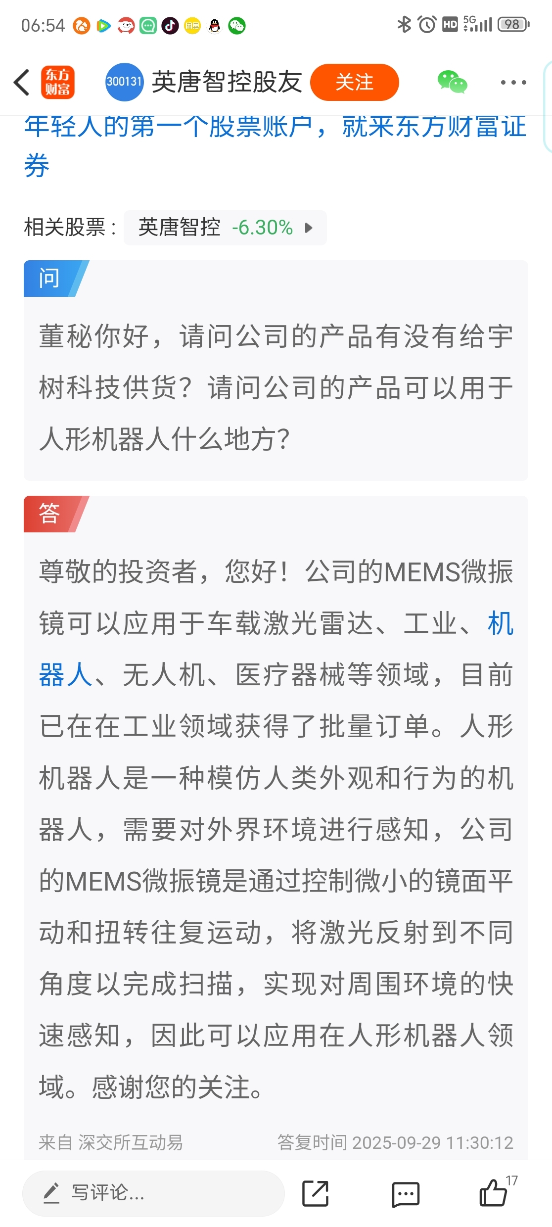 不敢直接回答,应该有保密协议,这个不是间接告诉你有跟宇树机器人合作吗。