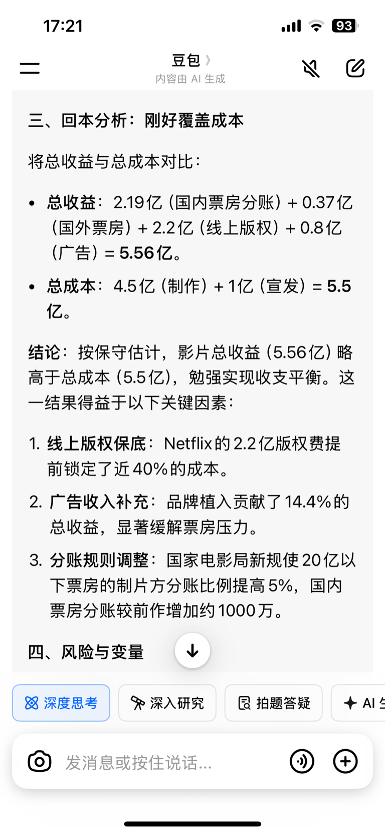 $华策影视(SZ300133)$ 豆包了下,国内票房五亿还是能回本的